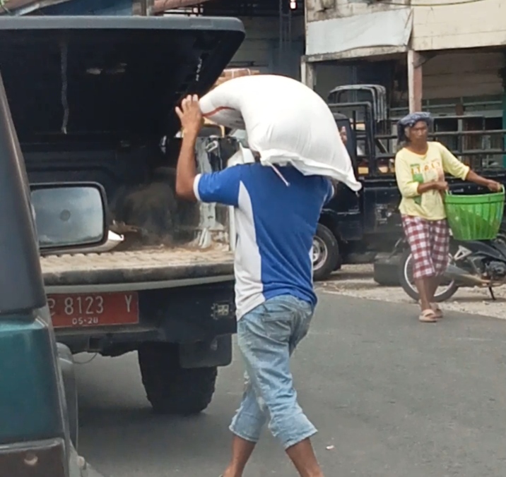 Silih bergantian pekerja menumpuk karung dengan melintasi jalan. Terlihat orang yang mengemudikan mobil berplat merah itu mengenakan celana pendek berperawakan bongsor berkulit putih. Parkir kendaraan terlihat sembarangan karena nyaris ketengah hingga menggangu arus lalulintas.